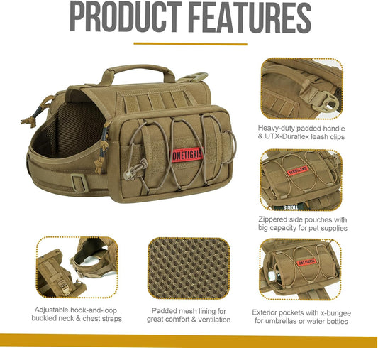 Dog Backpack for Medium & Large Dogs, Nylon Backpack for Dogs Tactical Pet Backpack with Side Pockets for Hiking Walking Training Running (Brown, Large)